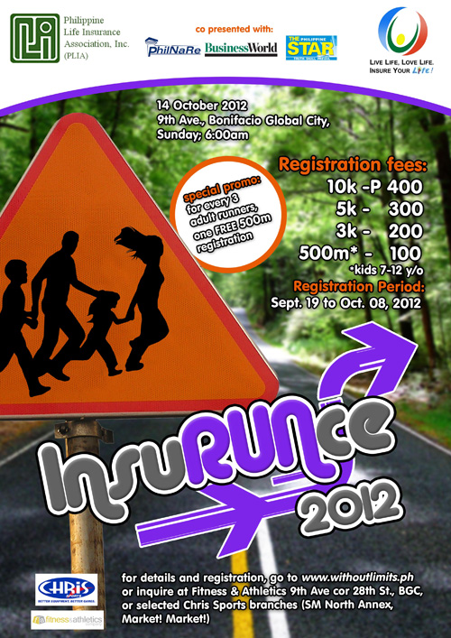 Consciousness Week (LICW) from October 1-5, 2012, the Philippine Life Insurance Association, Inc. (PLIA), the umbrella organization of all life insurance companies operating in the Philippines, is holding a family fun run dubbed as “InsuRUNce 2012”. “InsuRUNce 2012”, though spearheaded by the life insurance association, aims to bring together various sectors of the insurance industry, i.e. life, non-life, HMO, and pre-need, and the industry regulator: the Insurance Commission. This will be open to the general public, especially to families who may wish to start off their Sunday morning with a health promoting and bonding activity, as there will also be a Kids Run category (500 meters).
