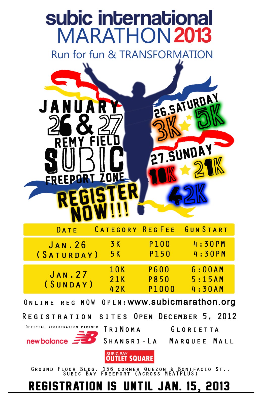 This January 26-27, 2013 we are inviting you to join the Subic International Marathon 2013! To more about the details, please check below: