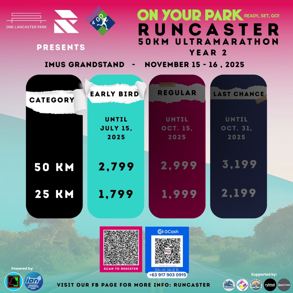 RUNCASTER 50 KM Ultramarathon is coming back for another year of grueling, challenging ultramarathon experience in Imus, Cavite, this November 15–16, 2025! Two categories are prepared for you: the 50 KM Solo Ultramarathon or the 25 KM category.