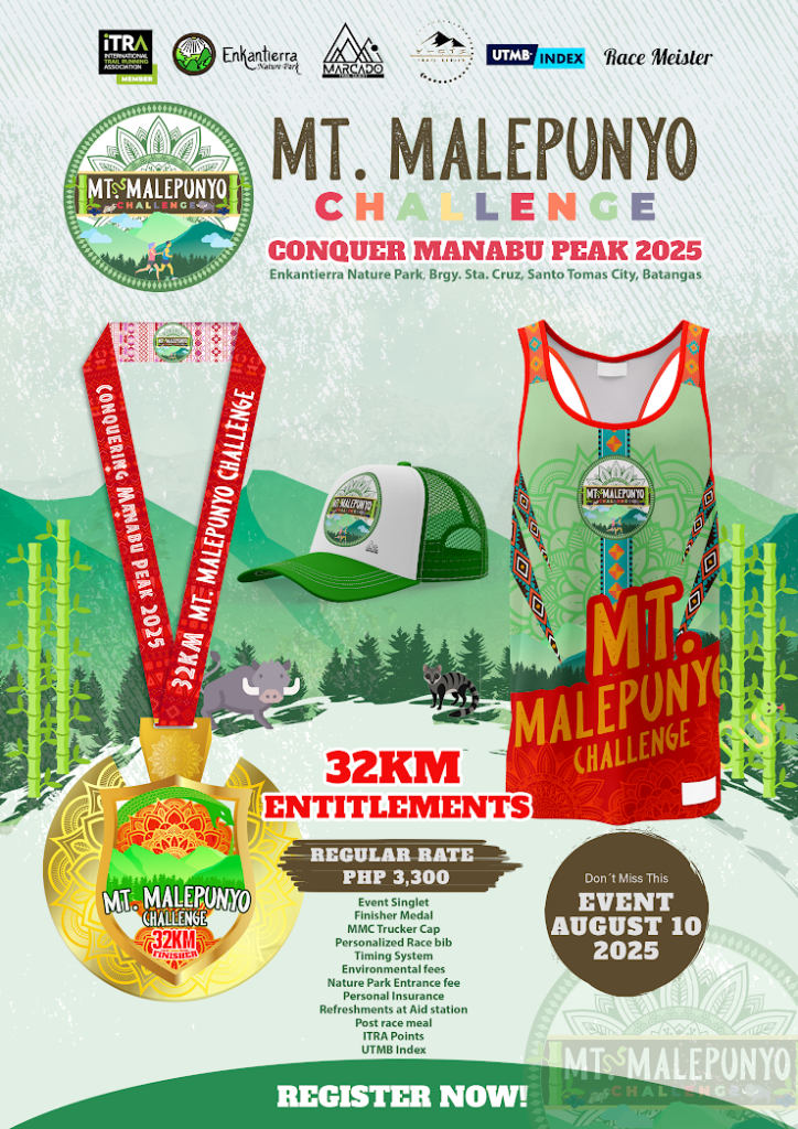 | 32K | P3,300 | Event Singlet, Finisher Medal, MMC Trucker Cap, Personalized Race bib, Timing System, Environmental fees, Nature Park Entrance fee, Personal Insurance, Refreshments at Aid station, Post race Meal, ITRA Points/UTMB Index |