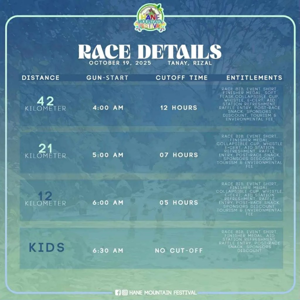 | 12KM | P1,700 | P1,850 | P2,000 | Race Bib, Event Shirt, Finisher Medal, Collapsible Cup, Whistle, E-cert, Aid Station Refreshment, Raffle Entry, Post-race Snack, Sponsors Discount, Tourism & Environmental Fee |