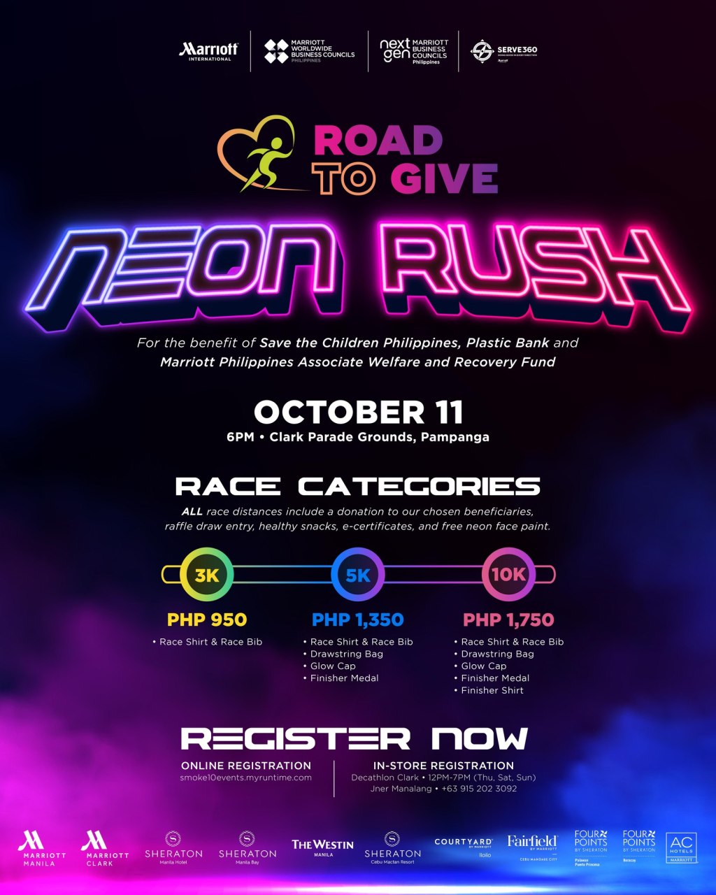 Runners of all walks of life are invited to join Road to Give 2025: Neon Rush, hosted by the Marriott Worldwide Business Councils Philippines and Next Gen Marriott Business Councils, on October 11, 2025 at 6 PM at the Clark Parade Grounds.